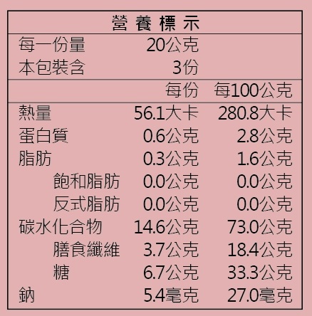 保存方式: 請保存於室溫陰涼處並避免陽光直射;開封後請密封保存並請儘速食用完畢。